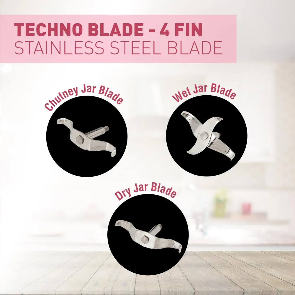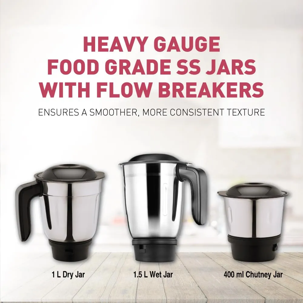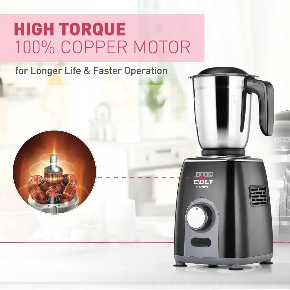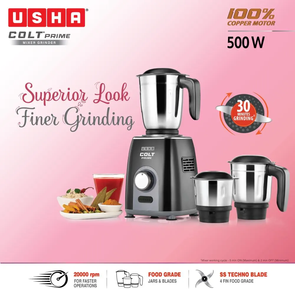 USHA Colt Prime Mixer Grinder| 500W| Powerful 100% Copper Motor| Rust Resistant Stainless Steel Jars & Blades| Uniform Grinding with 3 Jars| 5 Years Motor Warranty