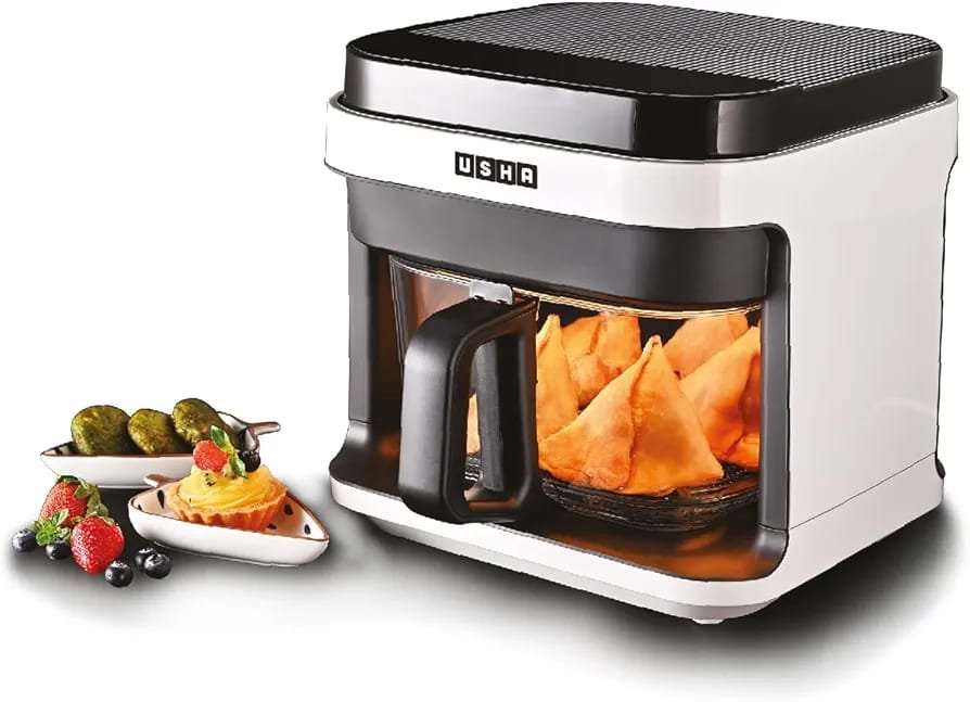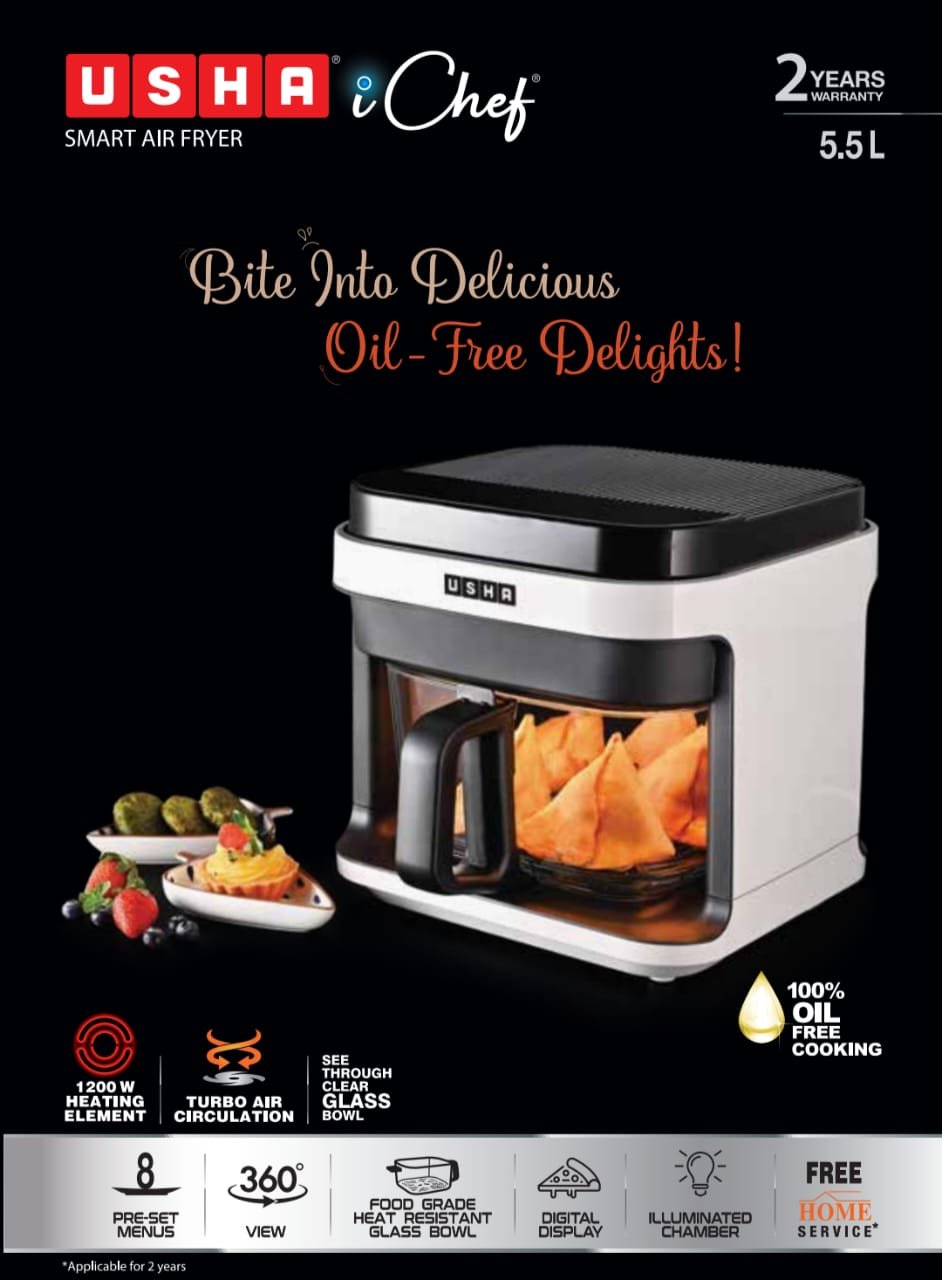 Appliances, COOKING APPLIANCES, SEWING MACHINEUsha iChef Smart Air Fryer 5.5L | 1200 Watt | 10 in 1 Functions | 8 Preset Menu | Turbo Air Circulation |360° View | Illuminated chamber | Oil Free Cooking | Digital display With Touch Panel (White)